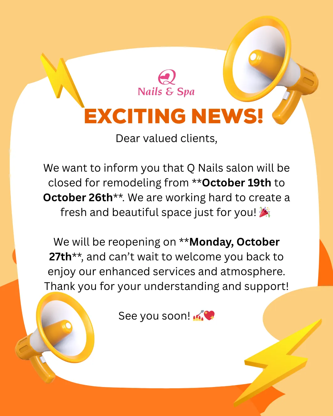 At Q Nails & Spa, our customer's satisfaction is of upmost importance to us. We vow to ensure you are happy with what you paid for.